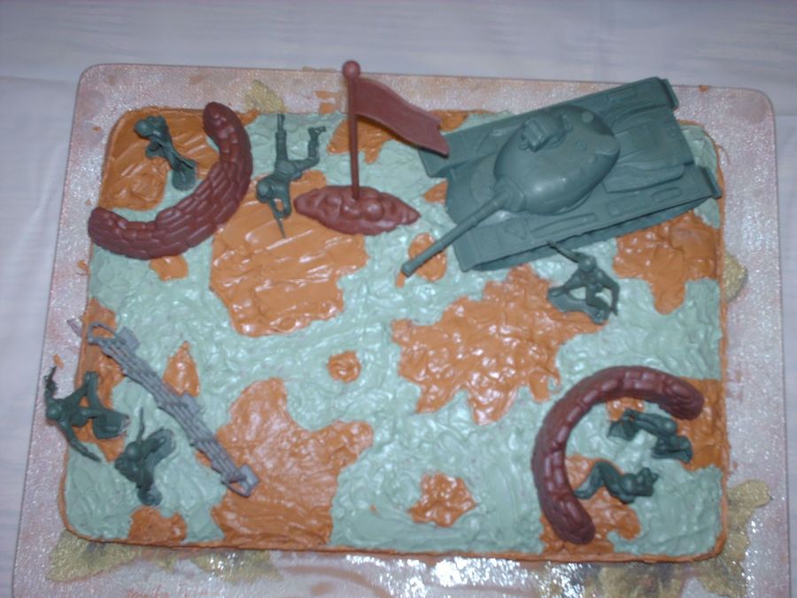 This cake was supposed to be camo...but when I finished with it, it kinda had a duel purpose...you can either see Camo, or grass and mud...which with the theme, works either way...This was my first real stab at decorating a cake!