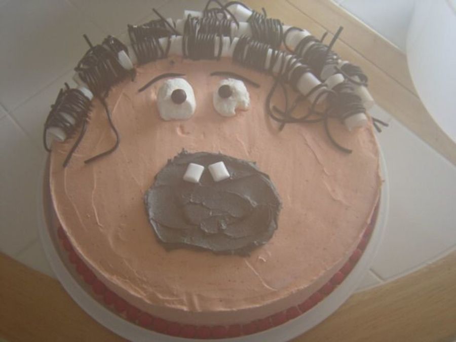 my mother in laws 50th Birthday Cake! Butter cream icing, licorice wrapped around plastic dowels that were cut to size, smashed marshmellows for the eyes and chicklet gum for the teeth.