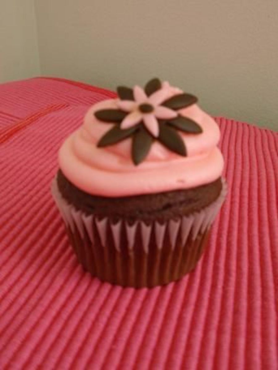 Pink and brown cupcake theme. It's buttercream icing with fondant accents. TFL