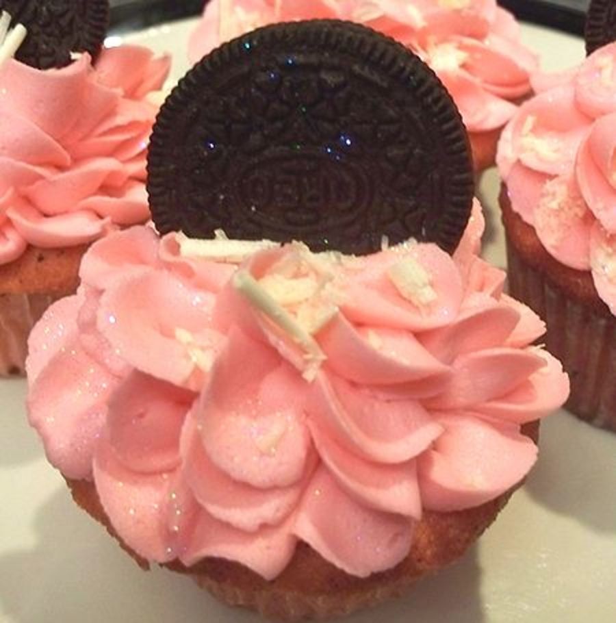 I made these cupcakes for my daughter to take into preschool. She asked me to make the actual cake pink as well, so it is pink colored scratch white cake with oreos mixed in. TFL!