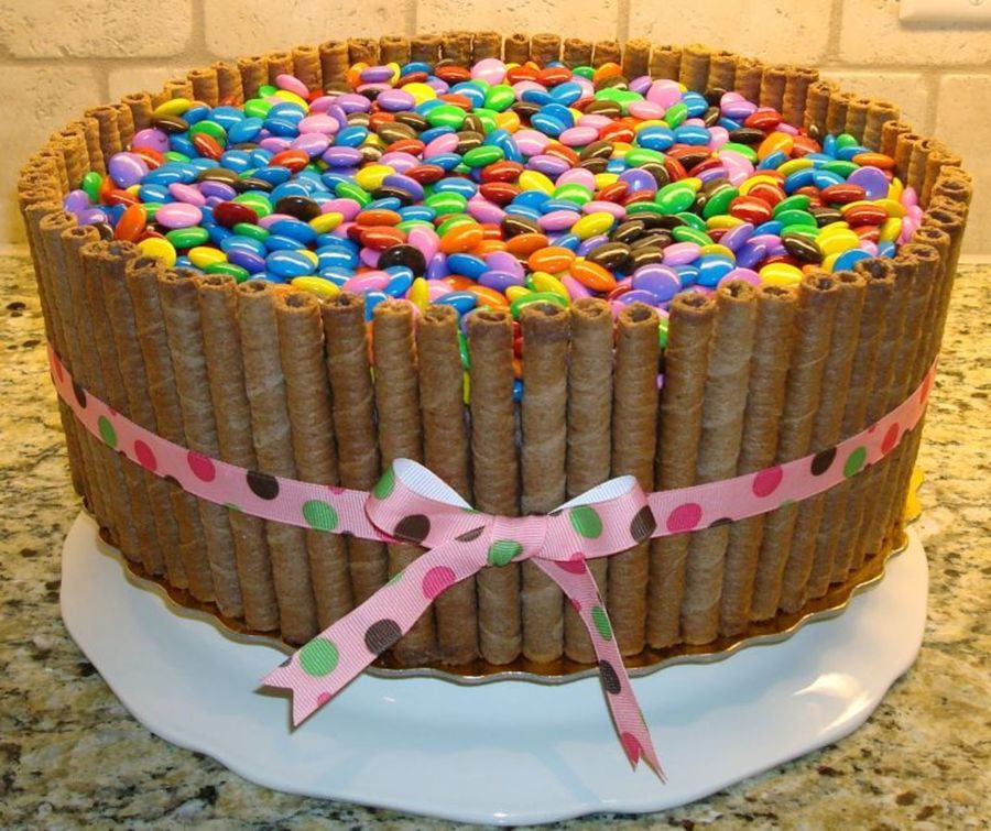My version of the candy barrel. Italian cream cake filled with vanilla pastry cream and iced with whipped chocolate ganache. I used rolled wafer cookies instead of kitkat because they are my kids' favs. Filled with "smarties".