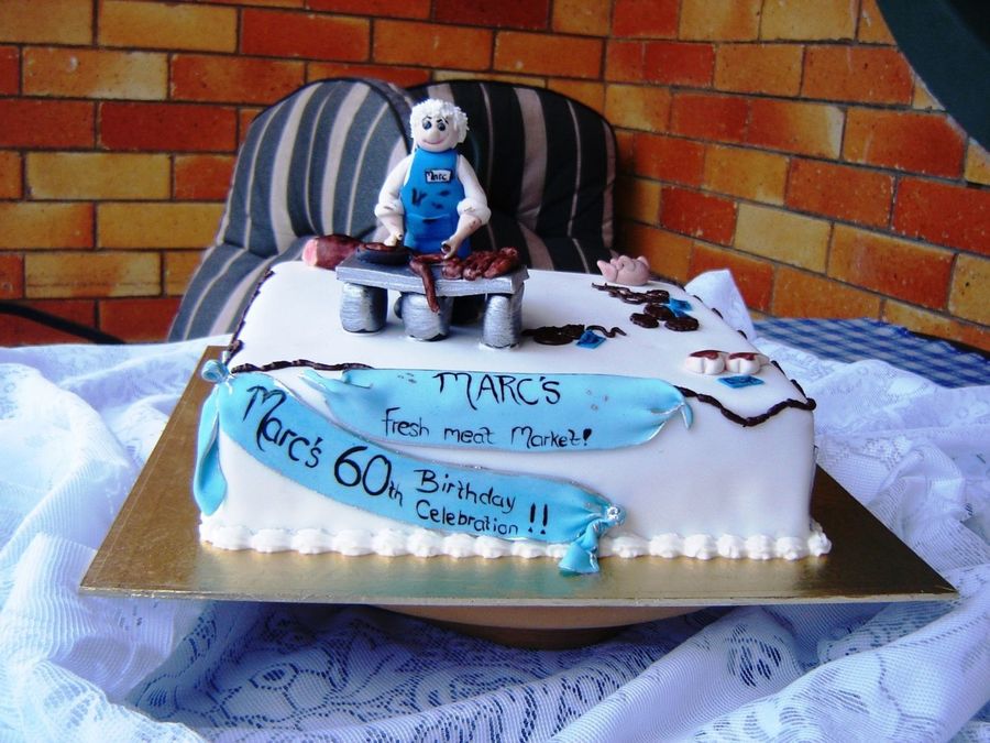 Rich moist chocolate cake, covered with sugar paste. Butcher is gum paste, as well as the chicken, Ham, Chops and sausage and table, the sausage around the top of cake is done with royal. all signs etc gum paste. The birthday boy is a Butcher, who turned 60, so i was asked to theme the cake in with that. Thank you for looking