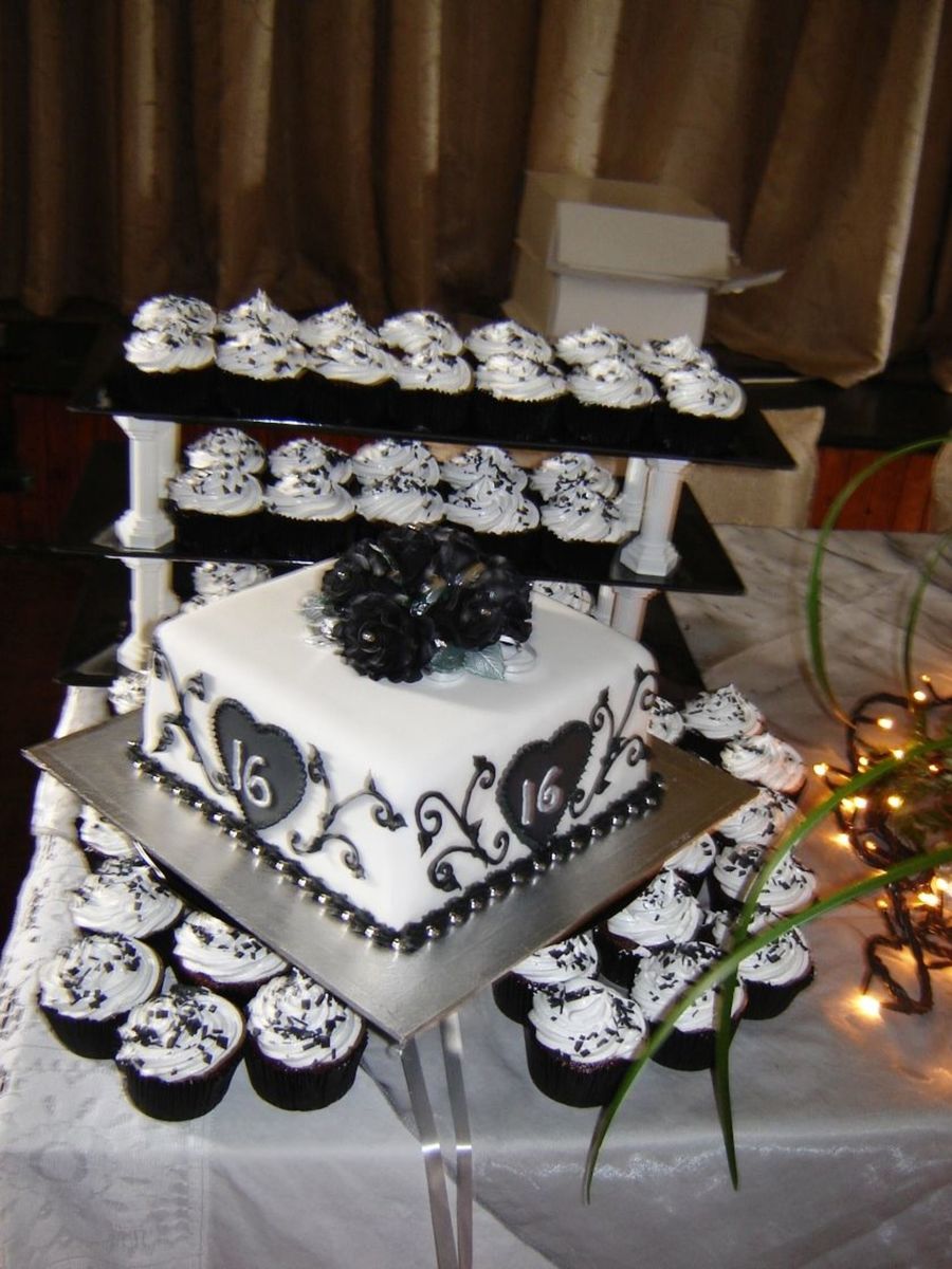 Chocolate sponge cake for the cake and cup cakes, cup cakes have italian meringue icing (without the butter - lol) and small black icing sprinkles, and the large cake has chocolate b.c and then sugar paste. Hearts are made from gum paste, roses ontop are flower paste roses with a silver ball in each centre, borders and scrolls as well as the 16's are RI. Thank you for looking