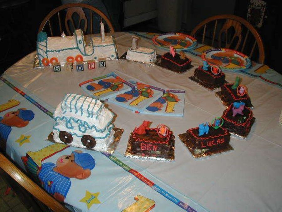 my sons first birth day cake. i saw a picture in a book and gave it a try the one in the book was alot nicer i was please it was my first attempt at a 3D type cake.