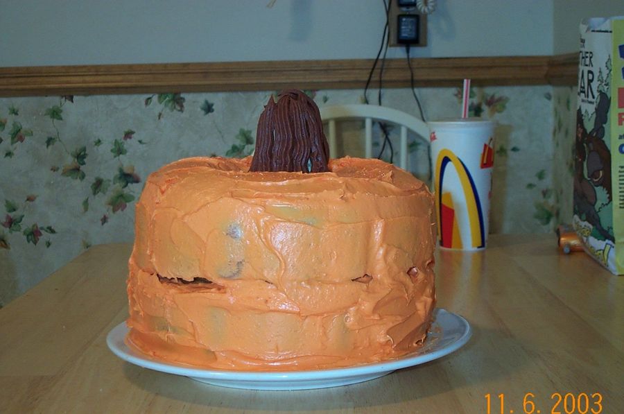 My sister's birthday is a couple of days past Halloween so I made her a pumpkin cake in about an hour. I used a bundt pan to make 2 layers and a joy ice cream cone as the stem. it's not the neatest, but pumpkins aren't all perfect anyway. November 2003