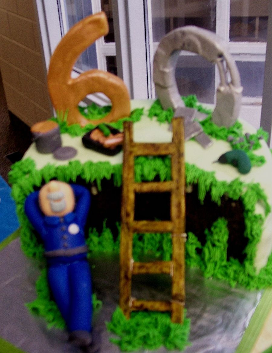 The cake is chocolate-raspberry with a ganache filling. Fondant icing and most figues. The 6, 0 and ladder are pastillage.