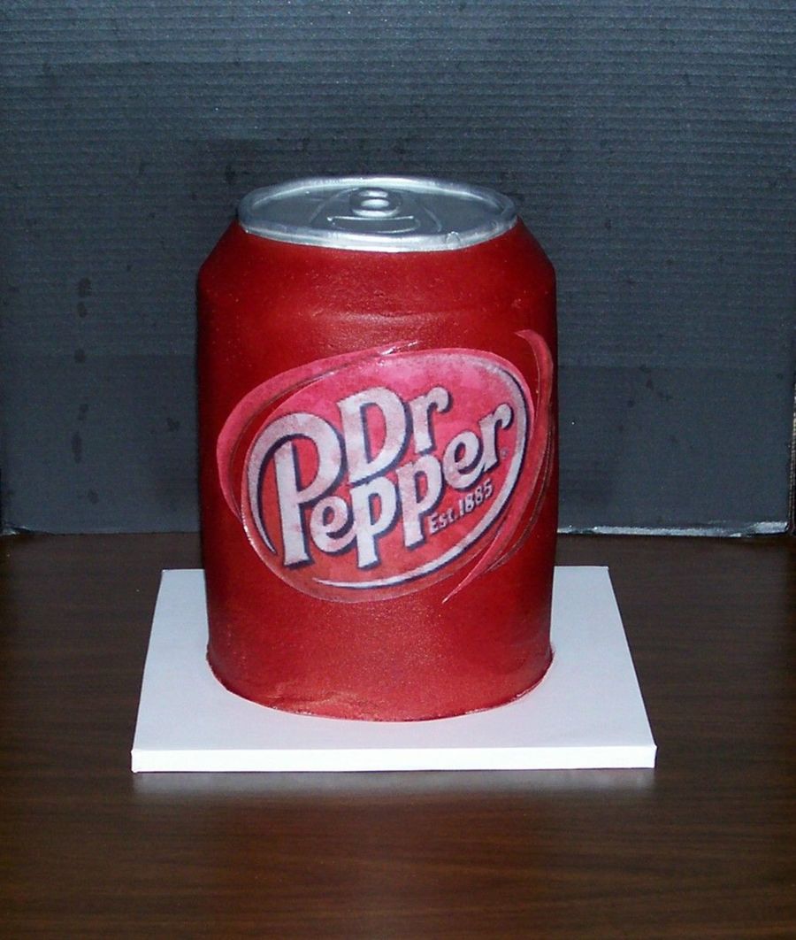 Made from two 2-layer 8" cakes sitting on a 3" x 8" styrofoam base--all frosted in chocolate buttercream and then airbushed with red for a burgundy effect. Dr. Pepper logo is an edible image on wafer paper. Top is fondant air-brushed silver. If the logo was just a bit smaller, it wouldn't look squatty but I was happy with it.