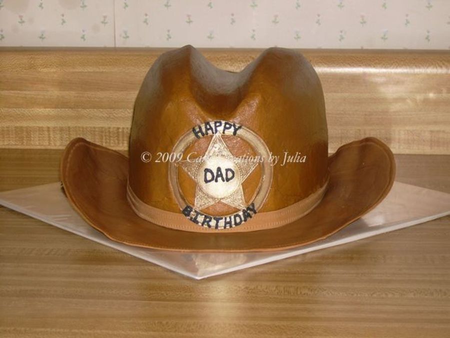 My first cowboy hat! White cake covered with Lemon icing. Crown was carved from 8 inch cakes. 12 inch GP/Fondant brim. Sheriff's badge hand-cut from textured GP/Fondant and painted with gold luster dust. Total height of cake is 6 inches tall.