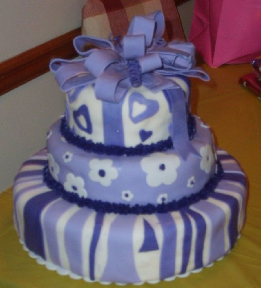 three tier stacked covered in fondant. TOP-choc cake Middle-white cake Bottom Yellow cake. Something for everyone at my neenee's 50th birthday party! She loves purple!!