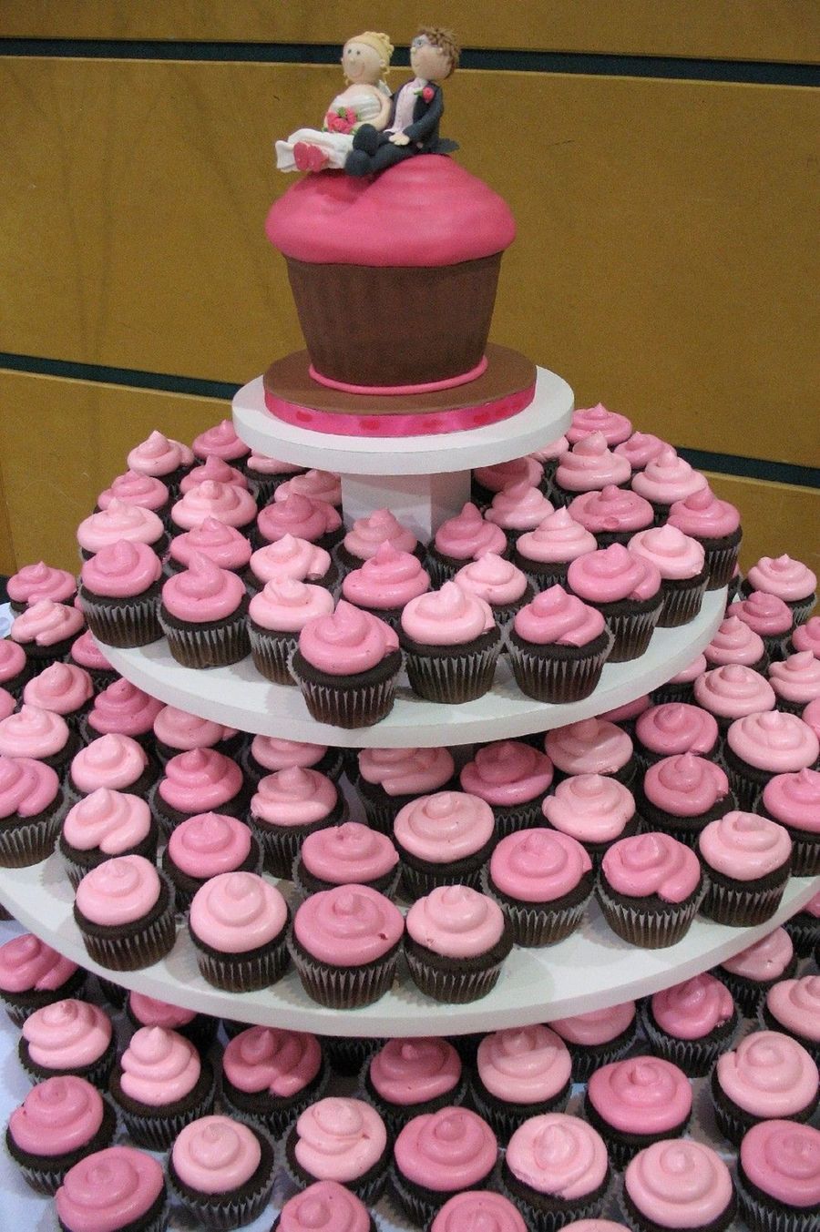 This is a 3-tiered cupcake stand with 280 chocolate cupcakes for a pink and brown wedding. A large fondant-covered cupcake-shaped cake on top with gumpaste bride and groom toppers.