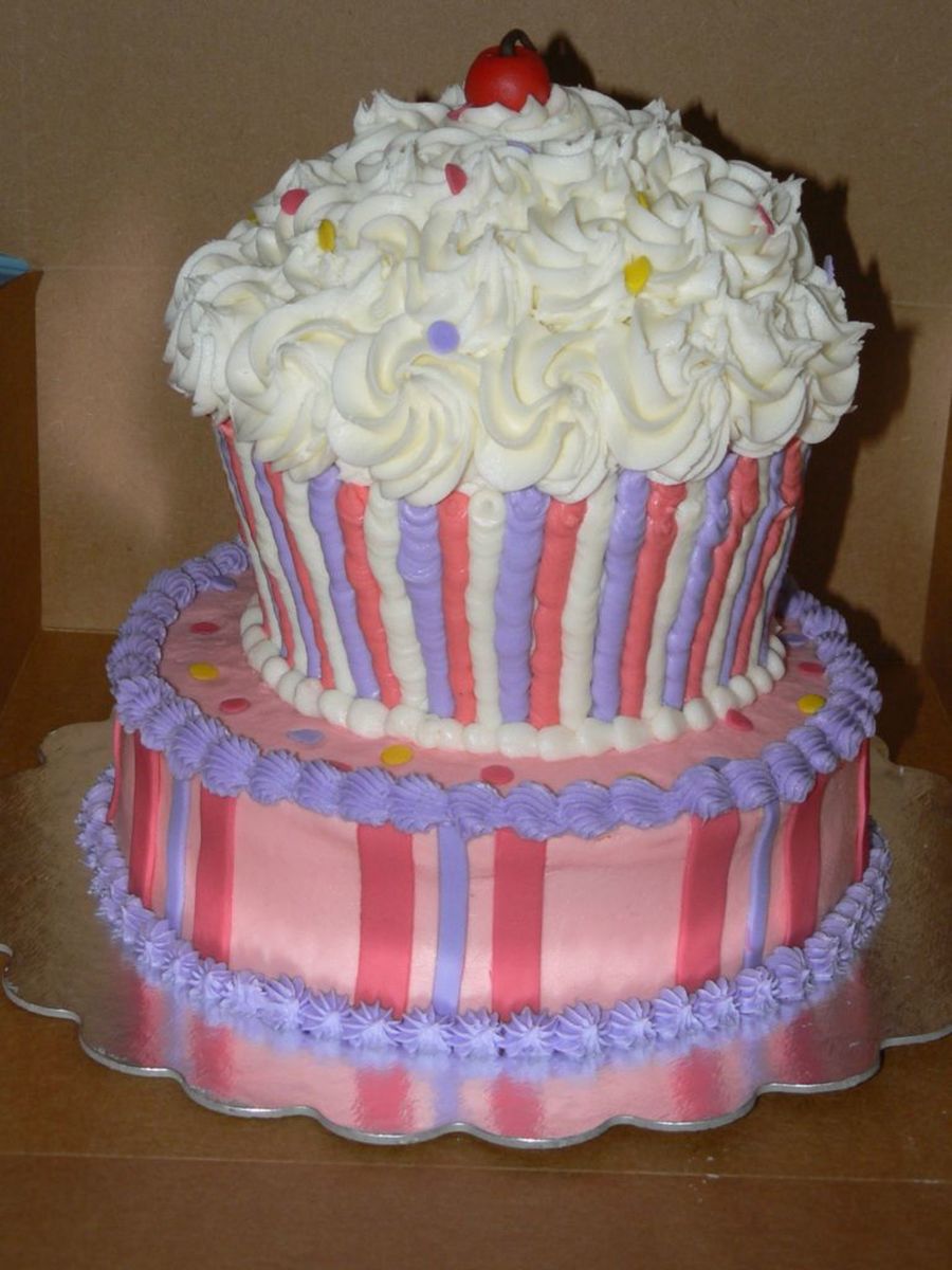 all buttercream with fondant cherry and sprinkles. used half the ball pan for the top of the cupcake