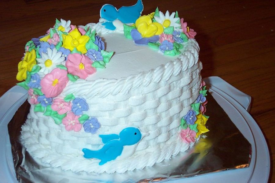A cake out of the Wilton 2 book. Buttercream basket weave and royal icing flowers.