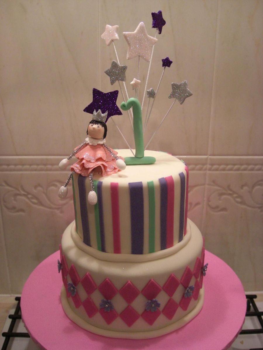 Bottom chocolate cake with chocolate SMBC, top vanilla cake with regular SMBC. Covered in fondant, all decoration fondant. I love how it turned out. My friend cried when I delivered the cake to her. Although the birthday girl doesn't know to appreciate the cake yet but at least the mom and everybody else loved it.