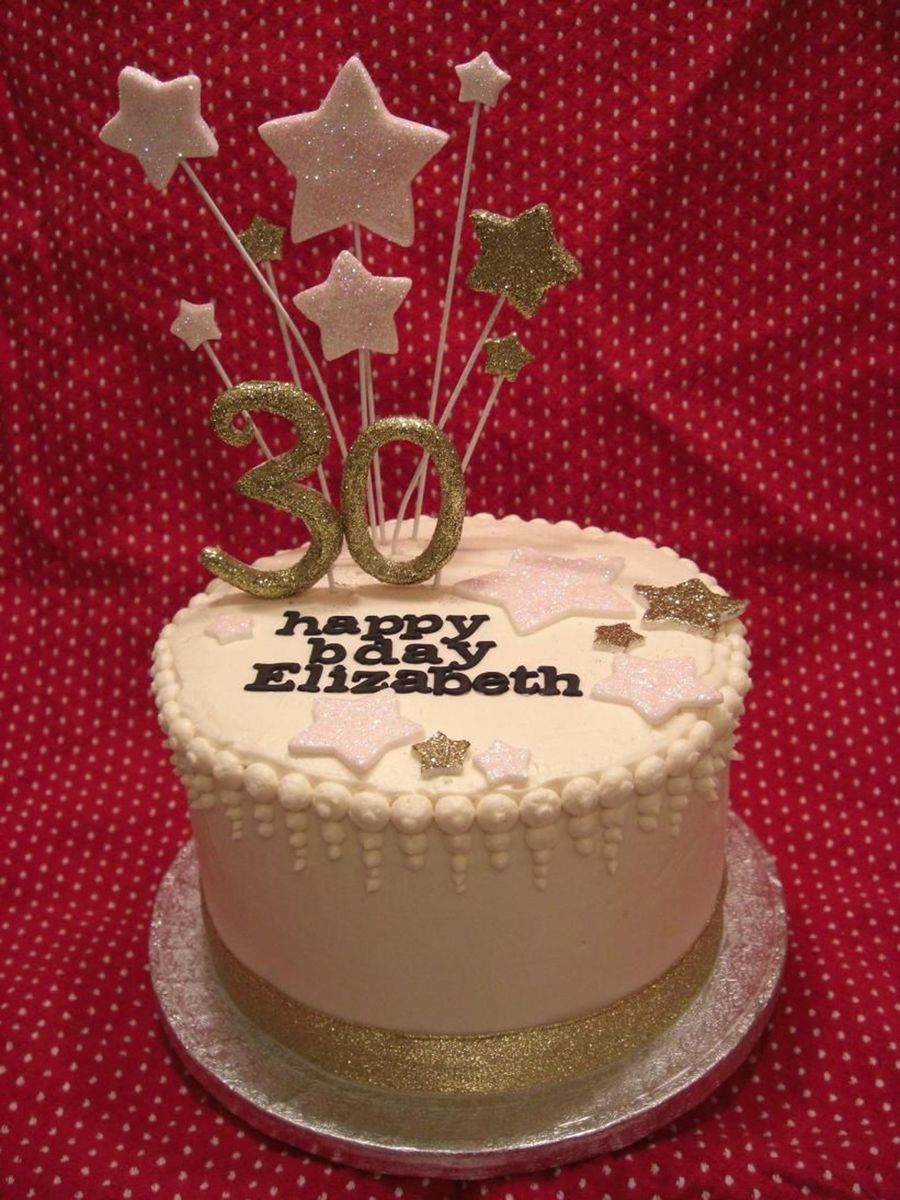 Made for friend's 30th birthday. Vanilla cake with strawberry filling, covered with SMBC. Fondant stars covered with disco dust