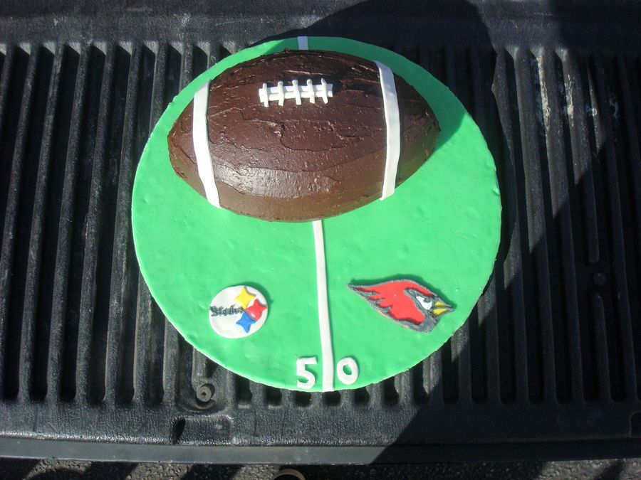 WASC cake filled and iced with ganache. fondant accents. took the pic on the tailgate of DH truck...thought it was appropriate for football. wilton football pan used (2x to make whole football)