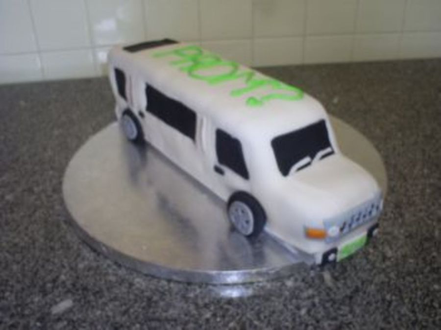 I made this hummer limo for a friend that was asking his girlfriend to prom. All white cake with buttercream and all fondant. The liscence plates have their names on them. PROM? written on top. Hummer written on the grill.