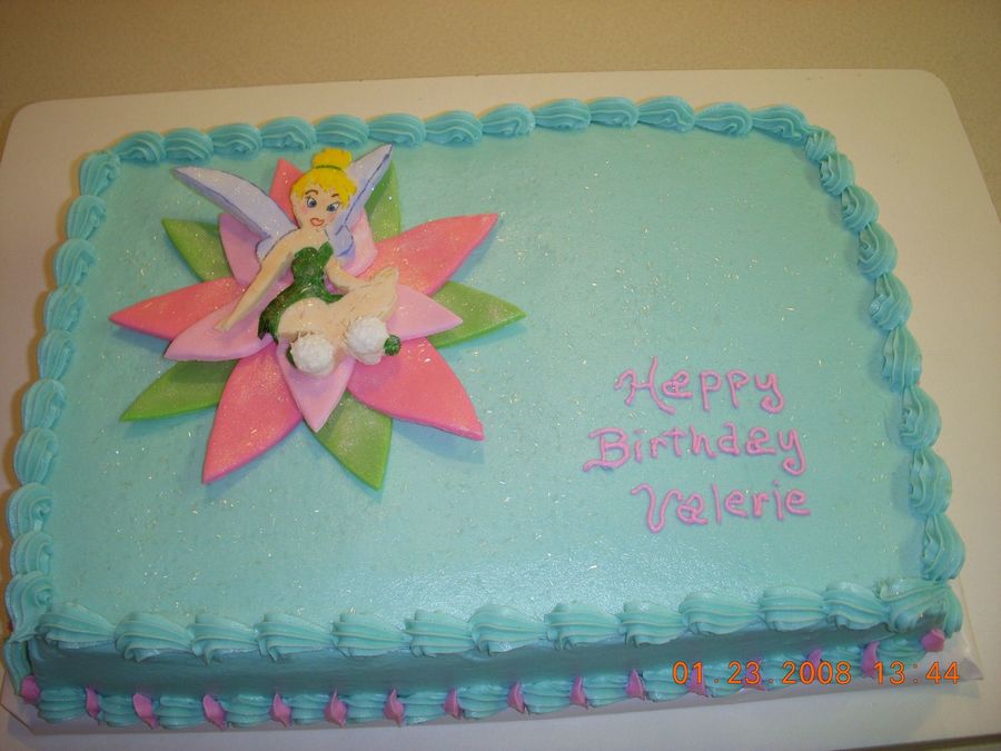 buttercream cake..... made tinkerbell pattern using mylar and hot pen.. sprayed pattern on fondant, cut with pme g/p cutting wheel, used coloring pens to color.... leaves and petals made from fondant... i saw several , here on c/c... with the petals and leaves... but don,t know right now the names that did them...