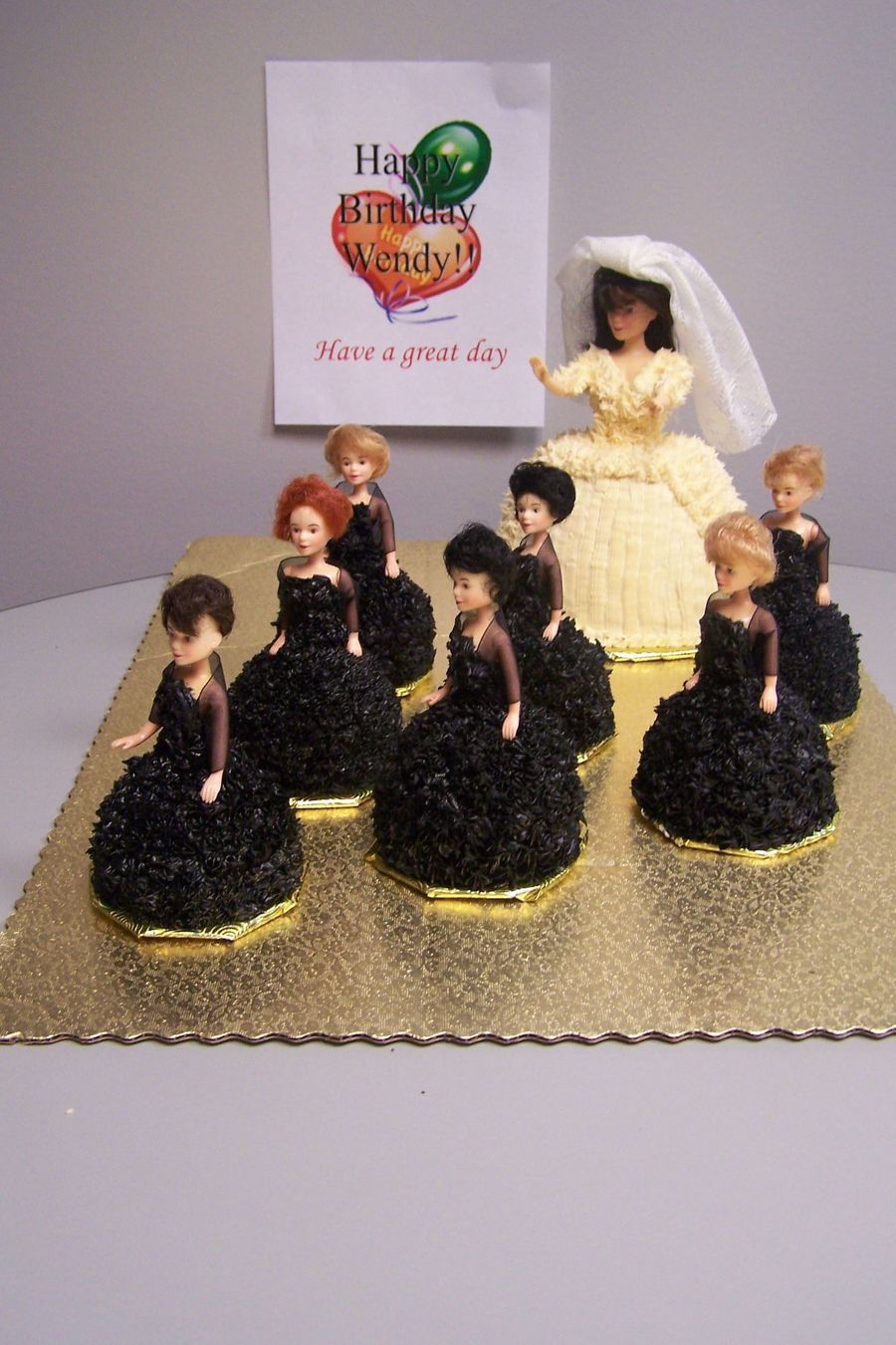 I made this for a friend's birthday - she was getting married later that year and the bride's maids wore black. Doll picks are Wilton's. Made the veil and shawls using tule.