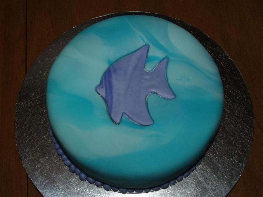 One of the first fondant cakes I made. I cut out the fish from the base fondant and inserted the different color fish cut from the same cutter. What a mistake. It didn't take long for the light blue fondant to droop down the sides leaving a mess of a cake. But it looks nice for a while!