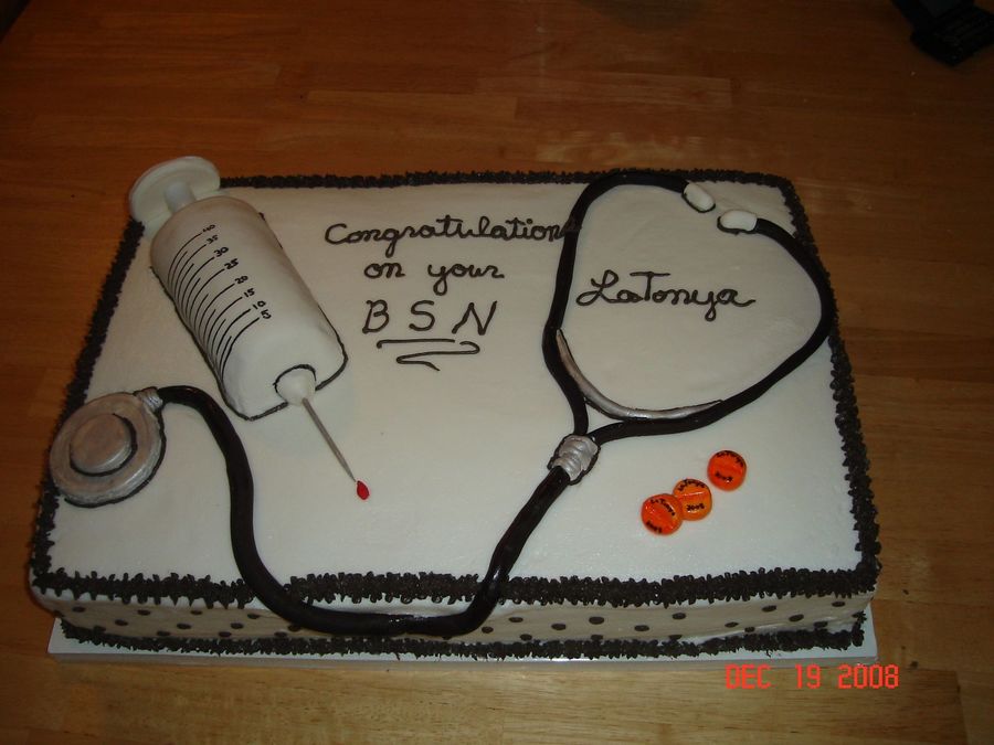 stacked sheet cake, with buttercream icing. syringe made with shaped cake and covered with fondant. All other decorations made with fondant.