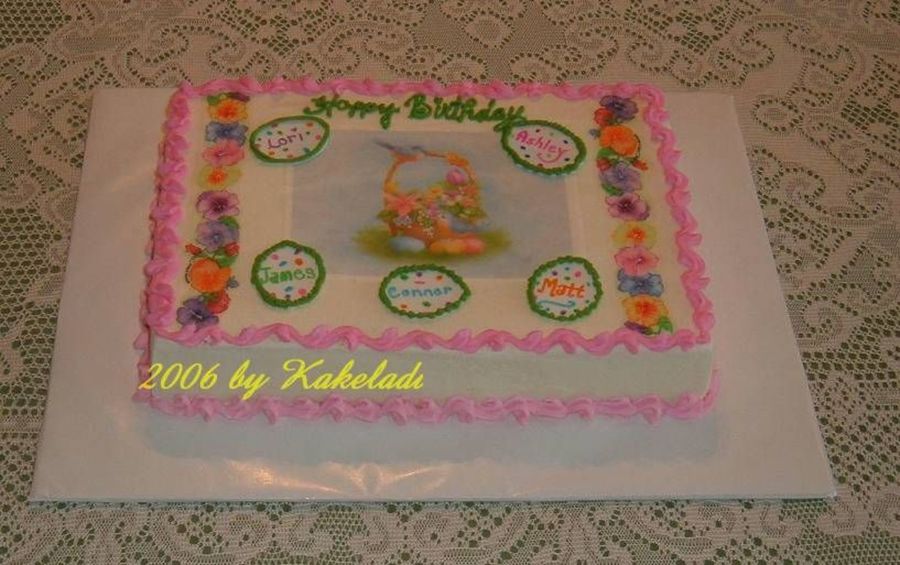Edible Images for spring (flowers) and Easter (center) are applied to an all buttercream 9x13x2 sheet cake. Individual eggs are fondant.