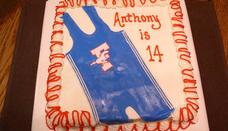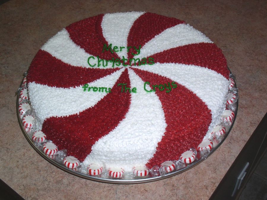 Large Peppermint cake for my husband's office. It is iced with buttercream stars and bordered with peppermints.