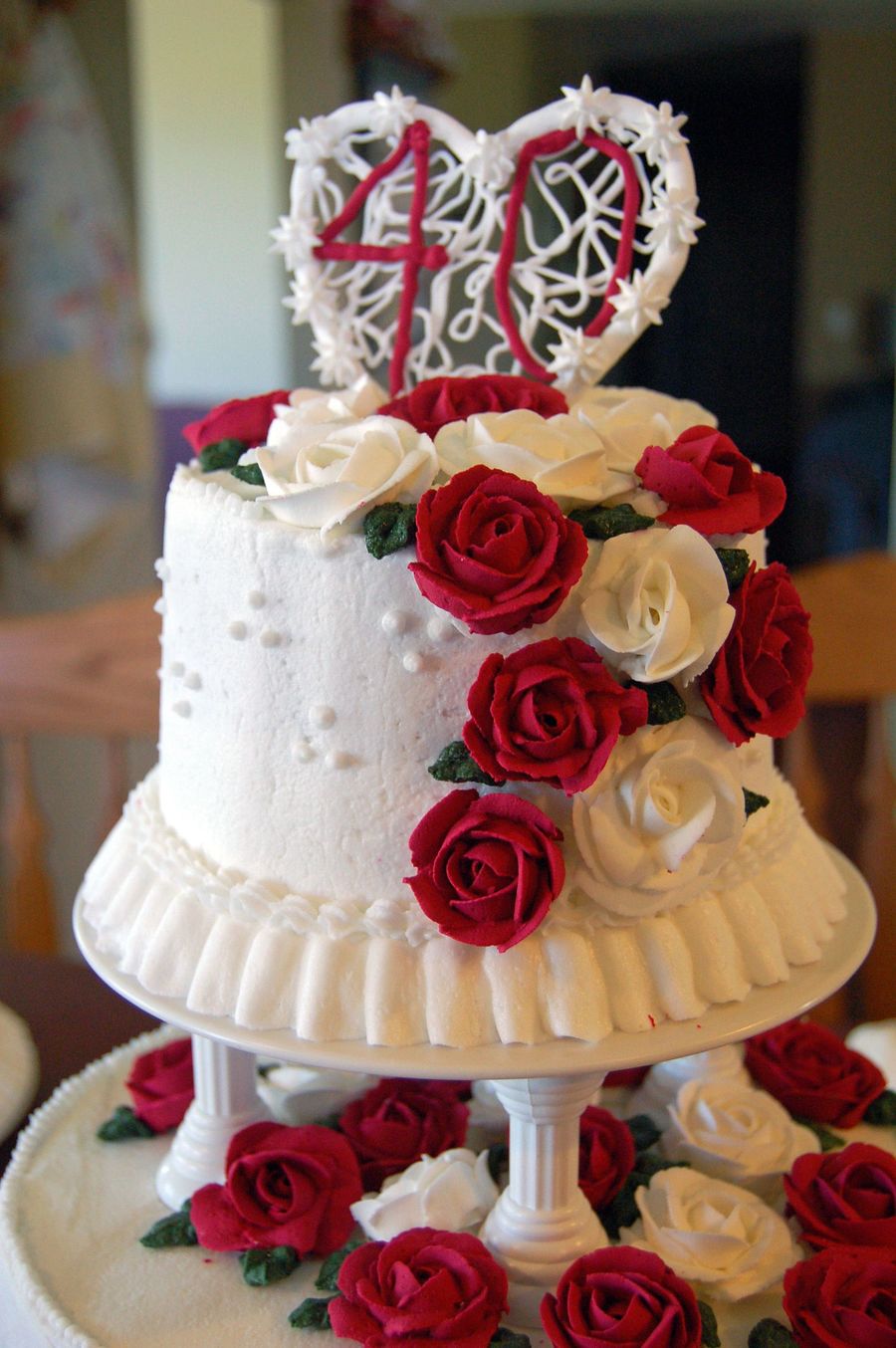 I made this cake for my in-laws 40th wedding anniversary. It was 3 tiers and 2 10-inch round cakes on the side. I tried to make the heart topper to match the ones that were on their original wedding cake (which were probably made of plastic) out of royal icing. The roses are also made from royal icing. This was the first time I'd ever done a ruffle. I put a lot of work into this cake and all they asked me to make was a sheet cake for their big anniversary party. I loved this cake when it was completed.