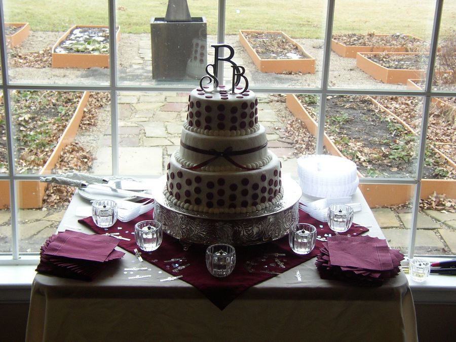 I copied a similar cake from this website...sorry I cannot remember from whom. This is a 10", 8", and 6" round cake with ivory buttercream and burgundy fondant dots and satin ribbon. The topper was ordered on-line. This was my baby sister's wedding cake.