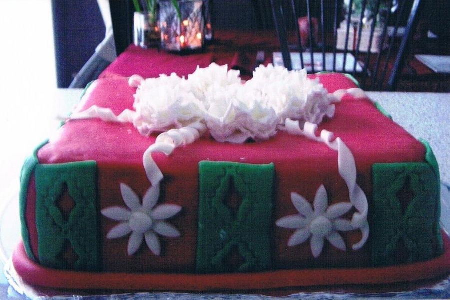Red, Green and White marshmellow fondant with strawberry filling.