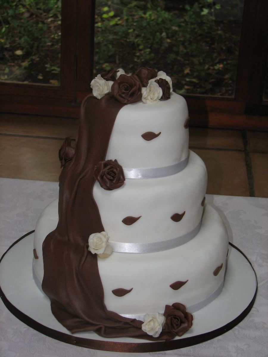 Vanilla sponge cake covered in white chocolate paste. Roses and drape also from chocolate paste
