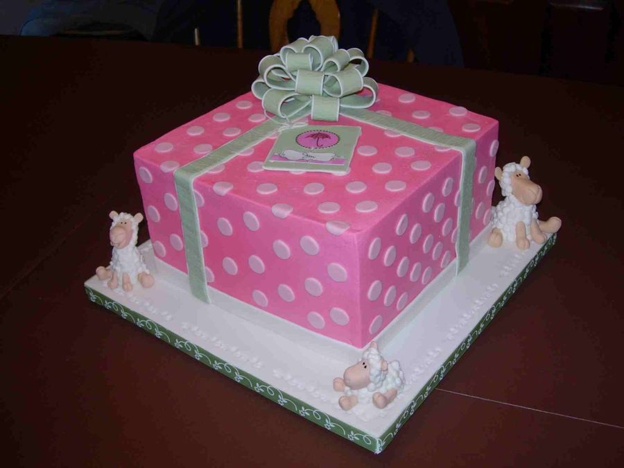 This is an 8" square. I used the shower invitation for the design idea. Buttercream with fondant accents. My ribbon looks bumpy, but that is because I used the fabric impression roller on it to give it some texture, but it doesn't show up in the photo. Thanks to Aine2 for her lamb video! TFL.