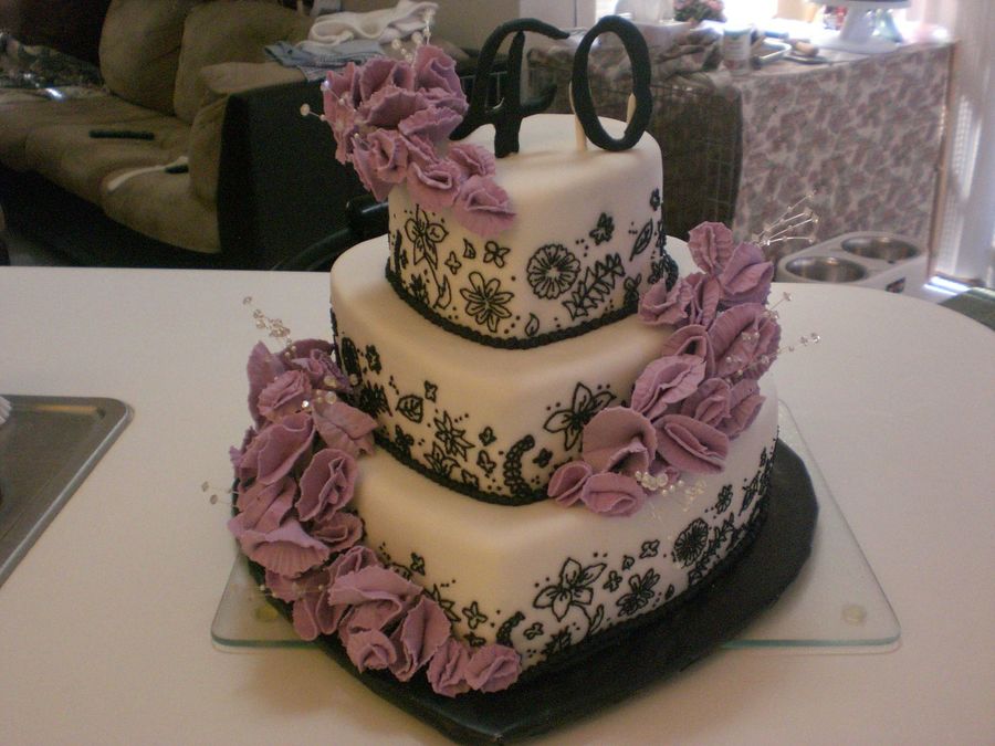this was a cake that was inspired by the wiltion 2008 yearbook. We fell in love with the color scheme and it seemed to fit with a 40th birthday, and elegant over the hill cake lol. the top tier was dark chocolate cake with milk chocolate filling, middle tier was strawberry with strawberry creme filling and third tier was white with pineapple filling.