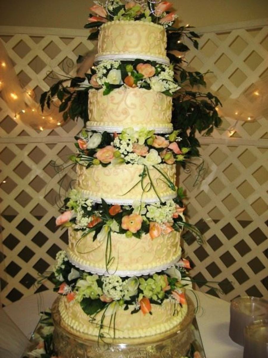 5 tier wedding cake decorated with silk flowers. White cake with cream cheese filling , butter cream icing in a two tone effect to accentuate the swirls piped on the cake