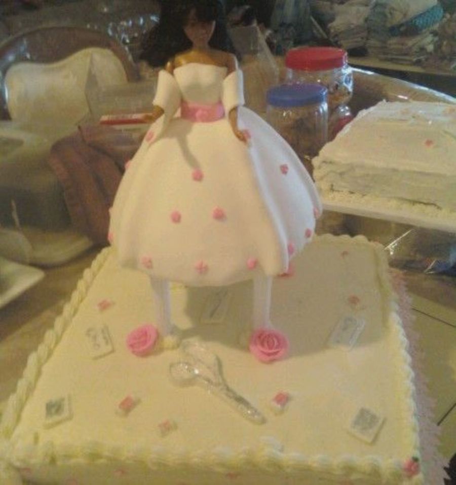 16 inch square red velvet cake covered in cream cheese icing and accented with chocolate sewing tools and royal icing flowers. Doll is also red velvet cake covered in cream cheese icing and fondant.