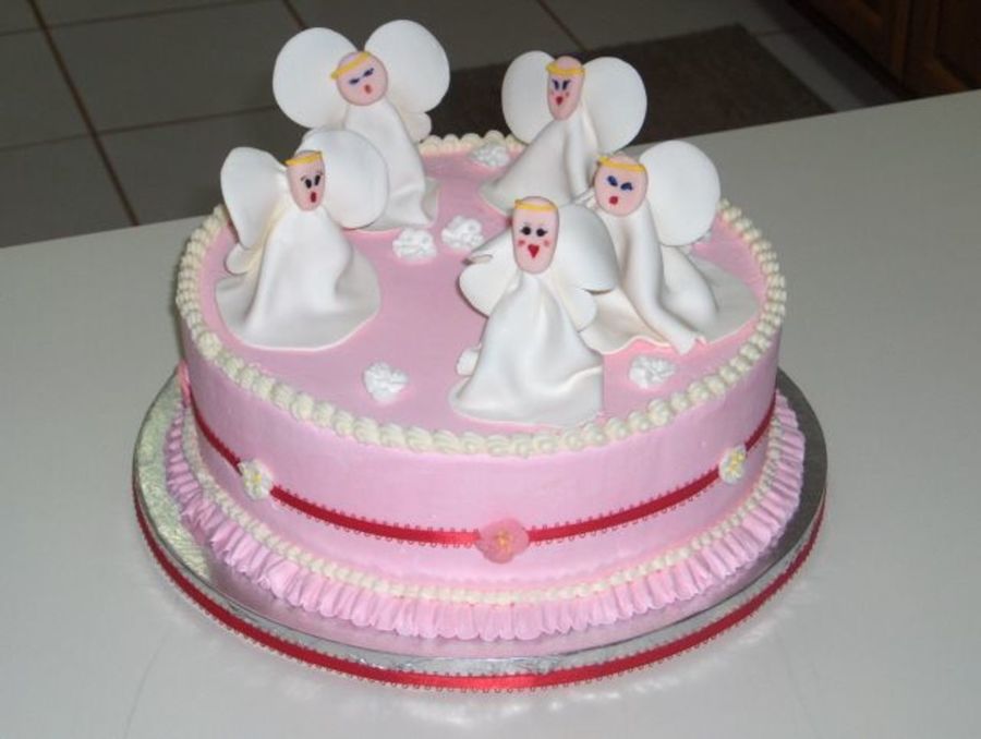 10" Italian Sponge with creme de cacoa ganache and canoli cream fillings, B/C with fondant/tylos angels. TFL
