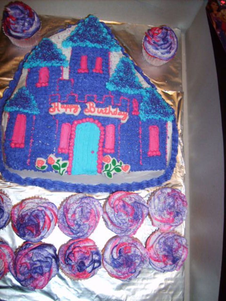 I used the Wilton Enchanted Castle Pan but did my own colors to reflect what my birthday girl wanted- Barbie Diamond Dream Castle Colors. I added some sparkles to the peaks then made matching cupcakes by stripping my bag. I thought I'd post this for fun, even though it's a Wilton design :-)