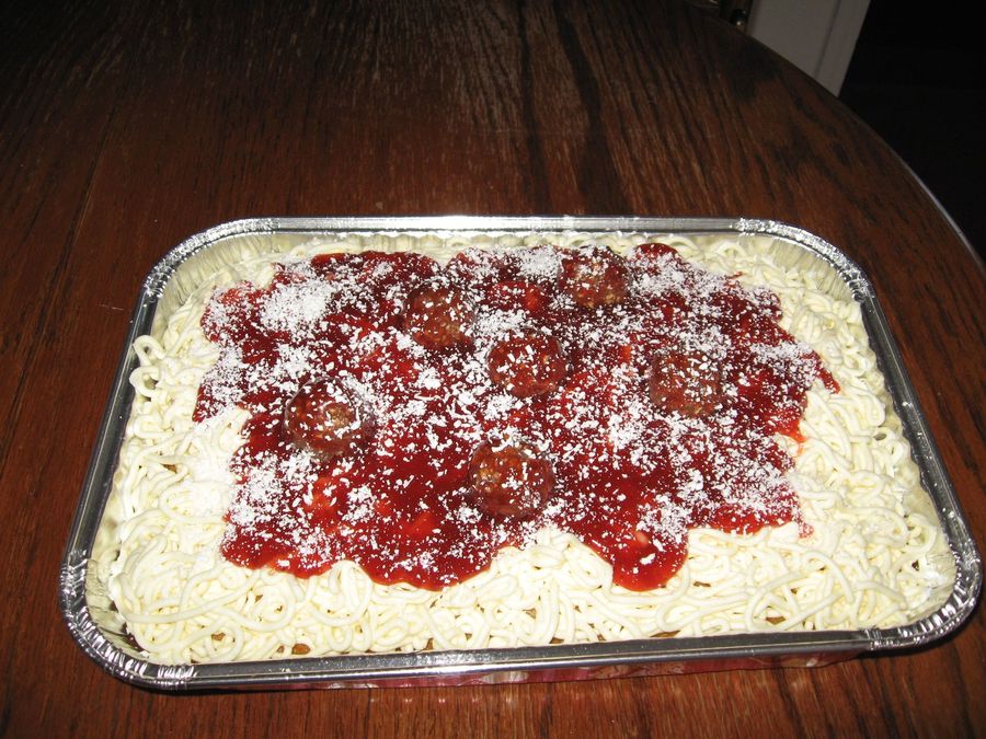 White cake iced in buttercream. Candy meatball and strawberry preserves for sause. This was super easy to make.