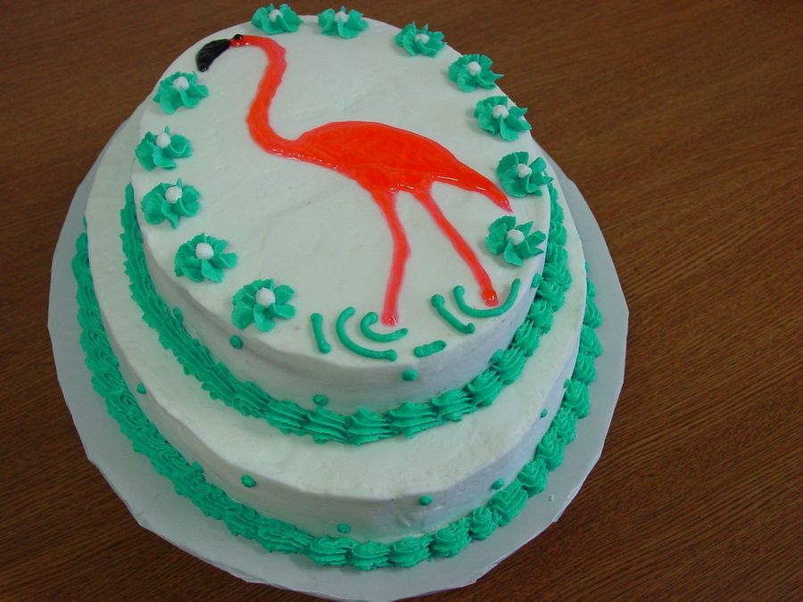 Did this for a bride for her lingerie shower, she loved pink flamingos. Used oval pans, bc icing, drop flowers, shell border, dots, piping gel for the bird, this was lots of fun to do.