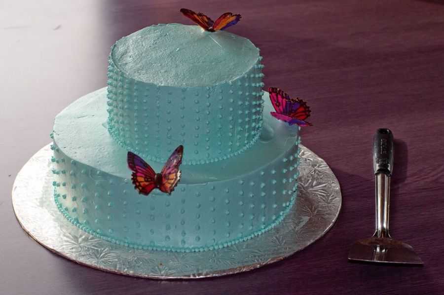 I did this birthday cake for work. I know it looks more like a wedding cake. I added the chocolate butterflies at the last moment. I think it would have been better if i make them all white. Anyway, the cake was lemon cake with teal tinted IMBC.