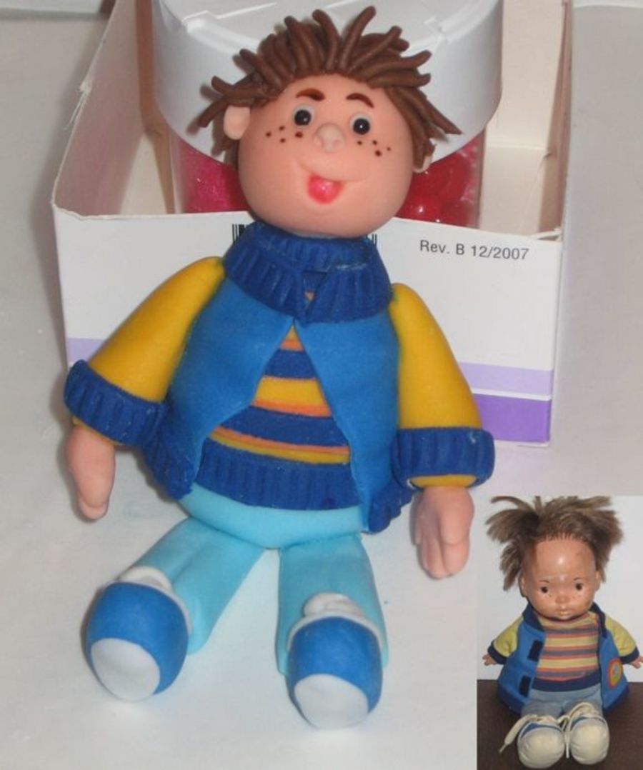 My husband has this doll "Joey" that he has had since he was 3 years old. Well tomorrow is his birthday and this Saturday I am having a party for him. When I asked him what he wanted his cake to look like he said "make me a topper that looks like Joey". So here is my sugar version of "Joey". I just love how he turned out.