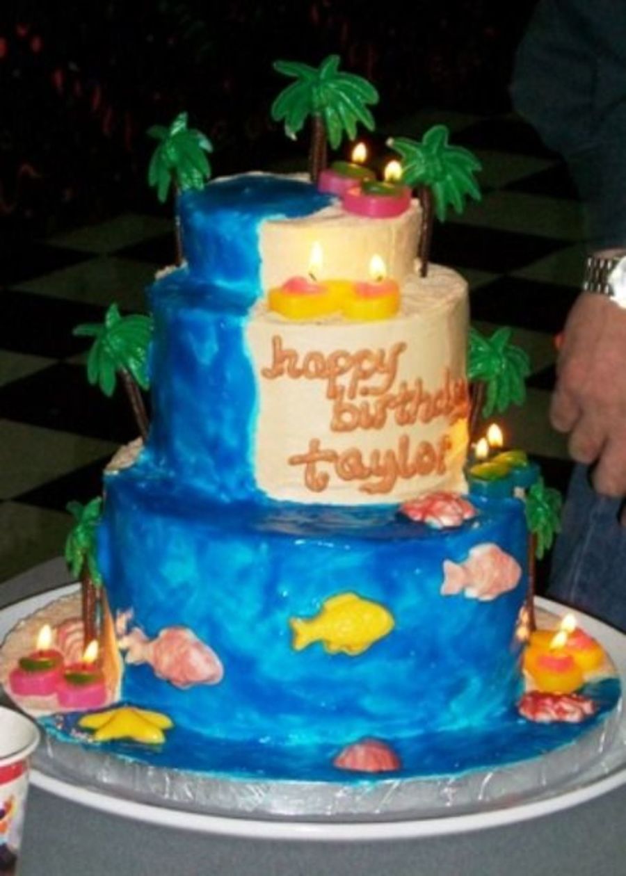 3 tiered funfetti cake! I used buttercream icing, piping gel for the water, sugar colored light brown for sand, the palm trees, fish, and sea shells are candy melts and the flip flops are candles. I used a Wilton Beach themed wedding cake as inspiration but changed it around to make it kid friendly.