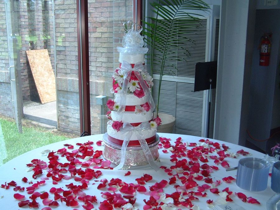 All buttercream icing. All cakes were vanilla with different fillings: raspberry, strawberry, lemon curd and pineapple. Put a wrapped oasis between top and second layer and filled with flowers. Air Conditioning was broken (90 degree day) and they threatened to make me move it to another building after it was all put together, but luckily a/c was fixed at last minute