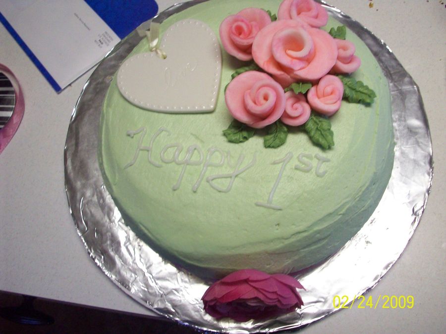 This is a cake I threw together last night in 30 minutes. The cake is marble, with a spicy chocolate ganache filling. My cousin called and asked if I could throw one together, because it was her anniversary. I just used some left-over fondant roses, and some ribbon and a silk flower I already had. I had a lovely ceramic heart that said "love", so I put that on top. I wish I could learn how to do the faux-fondant effect with the buttercream!!