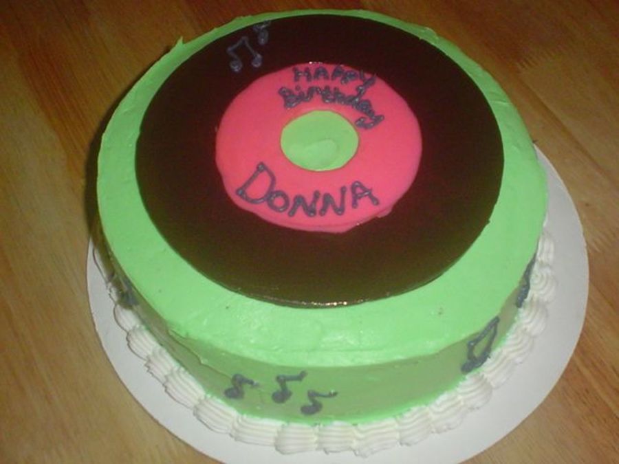 buttercream frosted chocolate cake with chocolate record on top