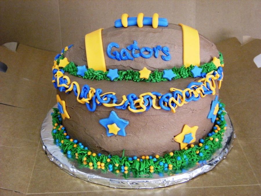 Cake is chocolate w/chocolate BC, football is strawberry RKT. Picture didn't turn out as good as I thought, can't really see the football contrast to the cake, should have made football a darker brown. Inspiration came from mamaof4