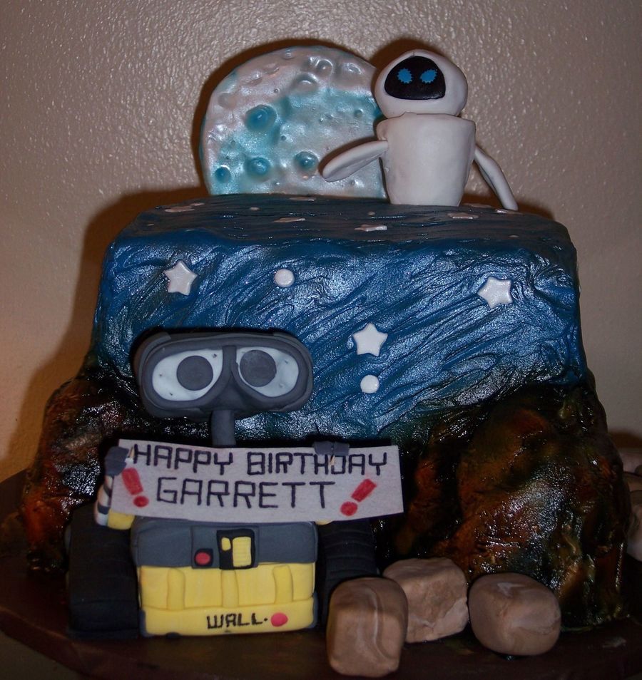 10" carved on bottom, w/ 8" on top. All buttercream, with fondant stars. Wall-E, Eve and trash cubes are RKT w/Fondant. Moon is cardboard covered in fondant. Sky and moon are also airbrushed with silver luster dust for an added sparkle.