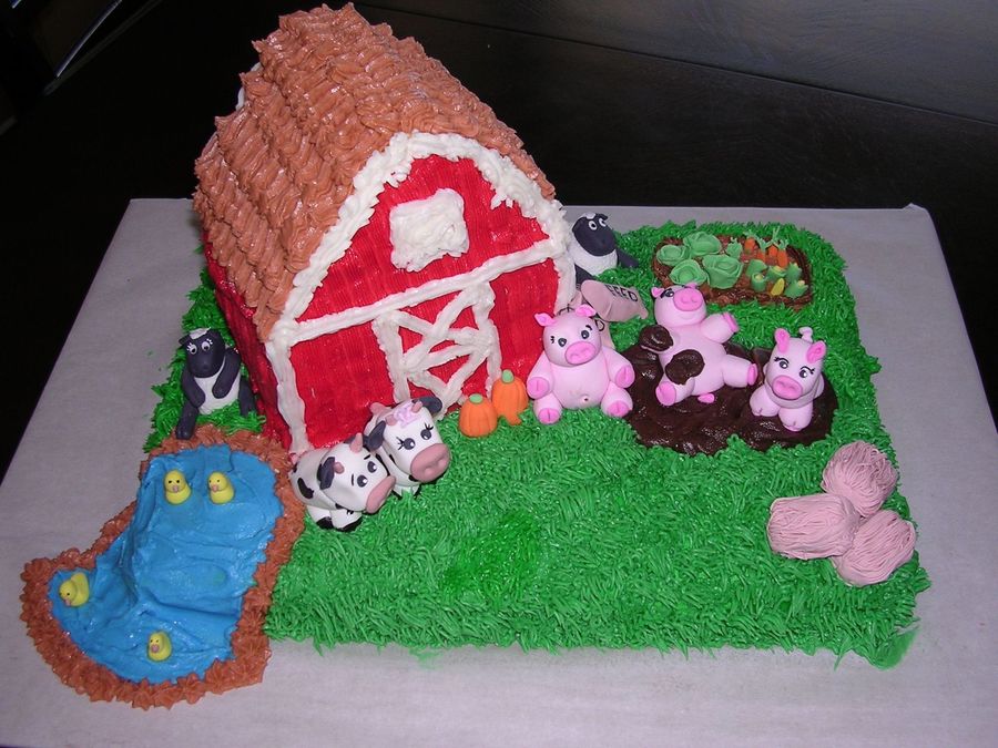 Farm cake for my daughters birthday. Yellow cake with cake barn. All fondant accents/animals.
