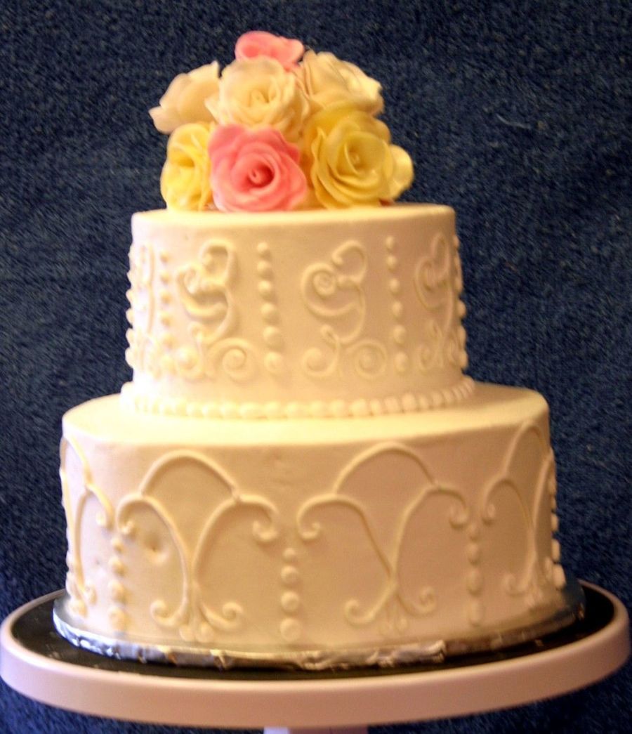French Vanilla cake, torted with Strawberry cream. BC with gumpaste roses. This was my first attempt at scroll work.
