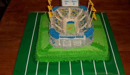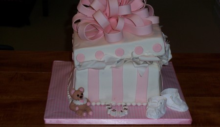 three tier, 10, 8, 6 covered in fondant. gumpaste bows and bow topper. board stenciled in royal icing