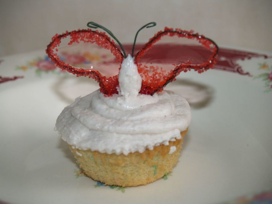 Vanilla cupacke with Cinnamon-honey buttercream frosting, adorned with gelatin butterfly wings.